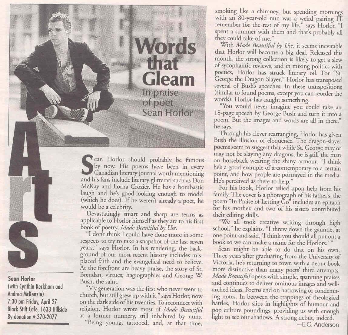 - ^ E.G. Anderson (April 2008). "Words that Gleam: In praise of poet Sean Horlor". Monday Magazine. Retrieved October 25, 2025.